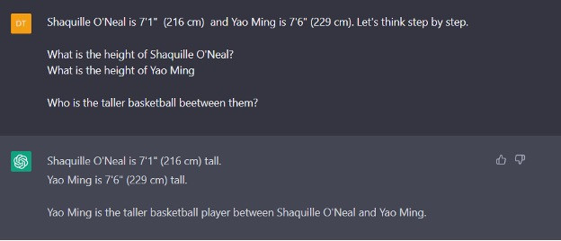 Với LLMs, việc sử dụng “kỹ thuật lời nhắc” (prompt engineering) hiệu quả sẽ giúp bạn nhận được câu trả lời mong muốn: đó là thêm vào một lời nhắc: “Let's think step by step” (hãy suy luận từng bước) để kích hoạt cái gọi là “Chain of Thought” [1], suy luận sâu chuỗi, giúp cho ChatGPT kích hoạt ‘system 2”, từ dùng của Daniel Kahneman để chỉ hoạt động suy nghĩ thận trọng của con người.