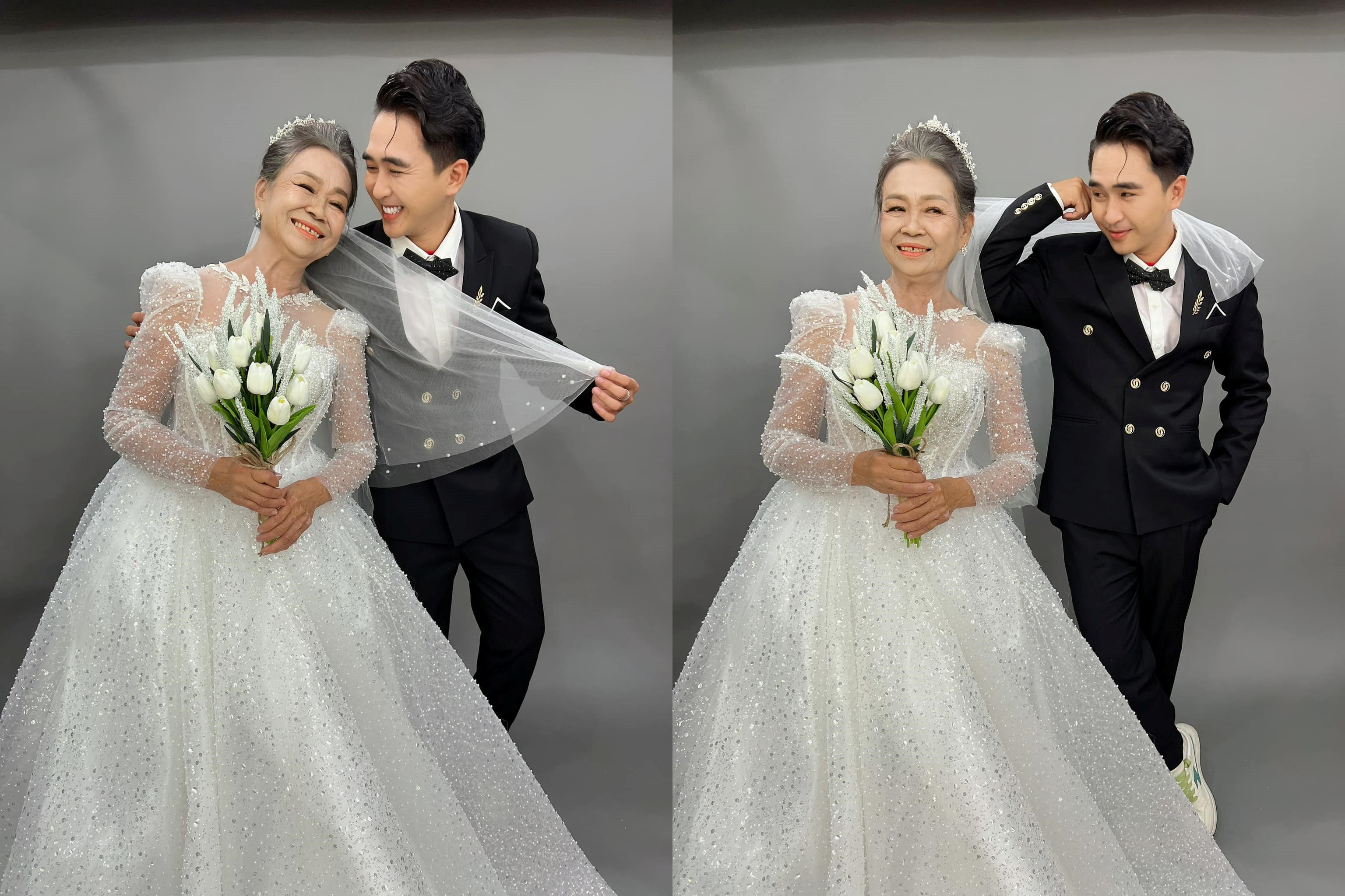 Sau khi được trang điểm theo phong cách cô dâu hiện đại, khoác lên người bộ váy cưới trắng tinh, bà Mến khiến ê-kip chụp ảnh ngỡ ngàng. Để bộ ảnh cưới trọn vẹn, Nhí quyết định biến mình thành chú rể đứng cạnh bà.