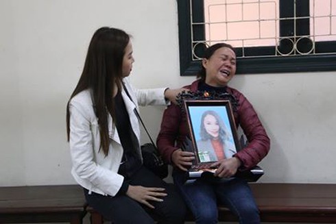 Mẹ cô gái trẻ mang di ảnh con khóc nghẹn ngào tại phiên tòa. |