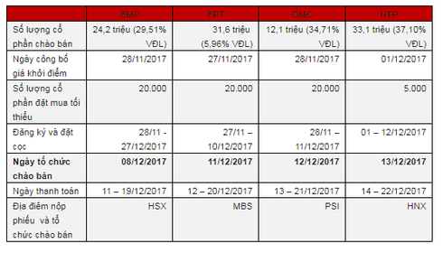 Với FPT, số lượng cổ phiếu chào bán là 31,6 triệu cổ phiếu, tương đương 5,96% vốn điều lệ. Ngày tổ chức chào bán là 11/12/2017.