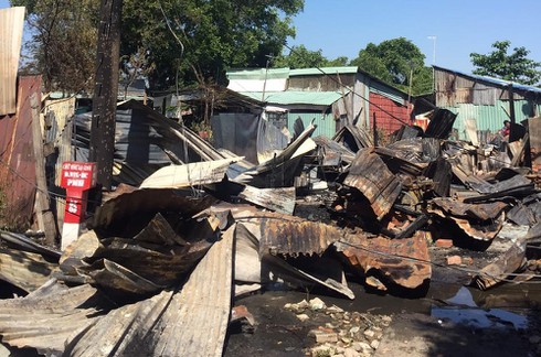 Hiện trường vụ hỏa hoạn khiến 10 căn phòng trọ và nhà dân bị thiêu trụi. |