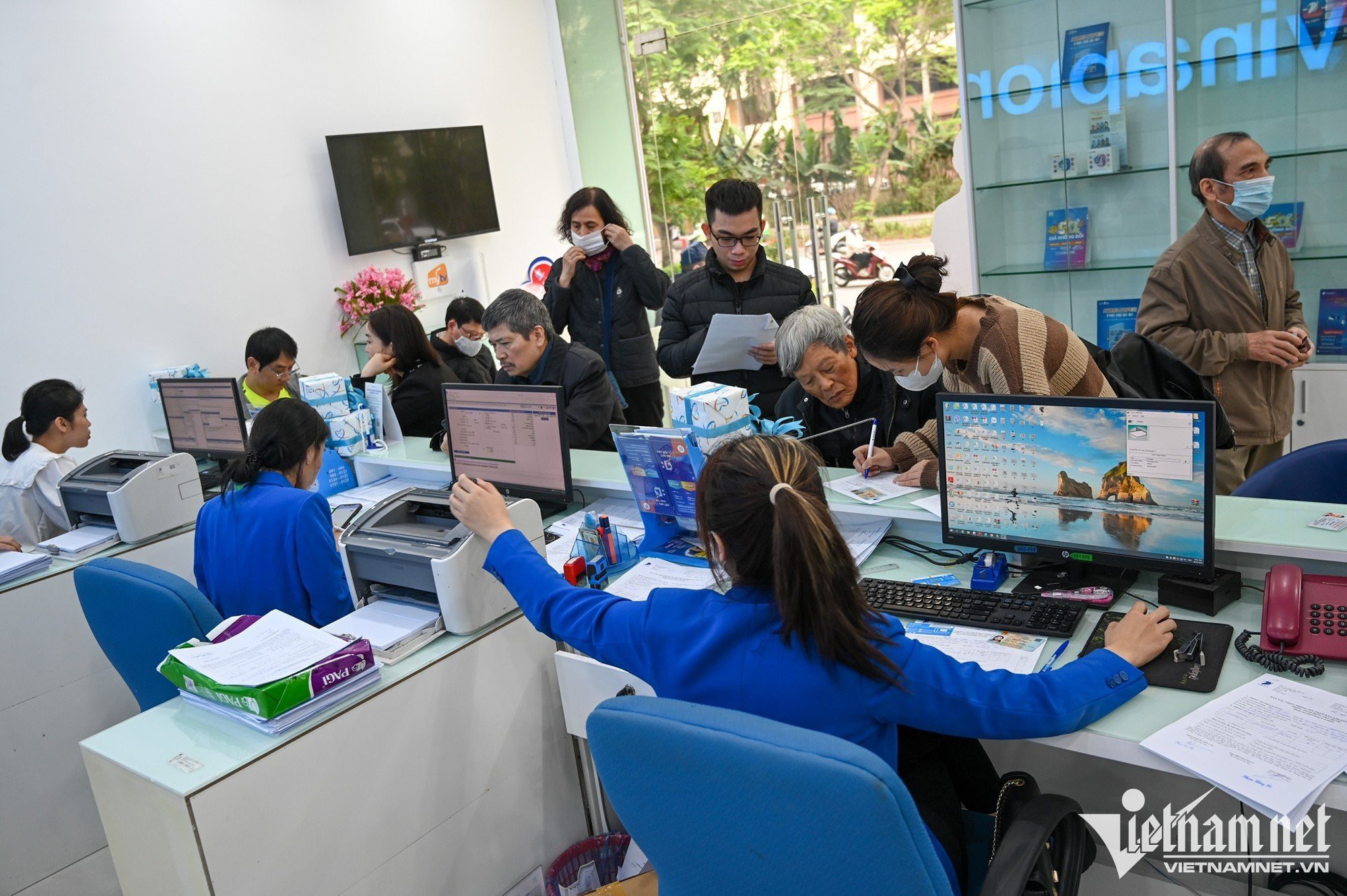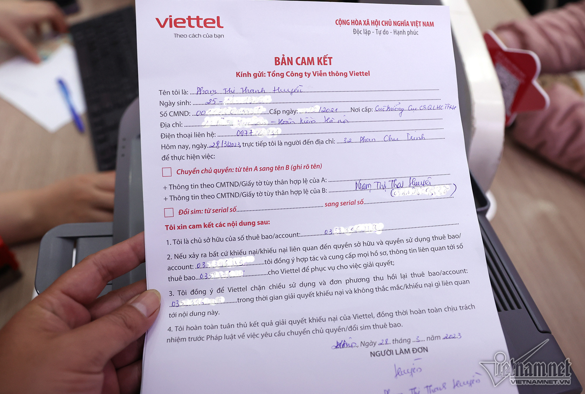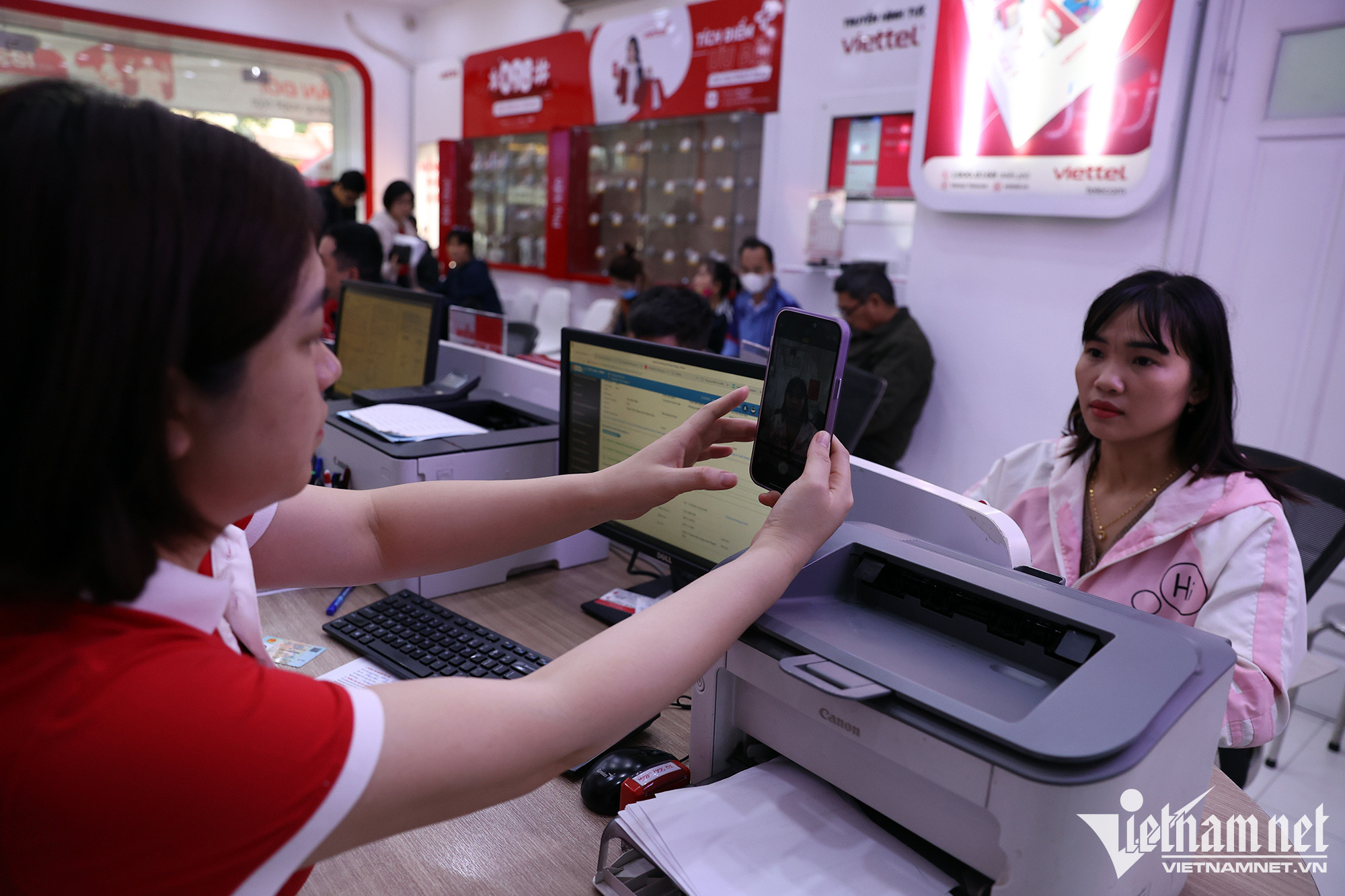 Cửa hàng dịch vụ viễn thông Viettel ở phố Phan Chu Trinh (Hà Nội) phục vụ từ 120 - 150 khách hàng trong những ngày qua, tăng 4 lần so với bình thường.Chị Phạm Thị Thanh Huyền (quận Hoàn Kiếm) được nhân viên Viettel hướng dẫn các thủ tục để đăng ký chính chủ thuê bao số điện thoại. Chị cho biết, số thuê bao điện thoại của mẹ chị (83 tuổi) nhận được tin nhắn từ nhà mạng yêu cầu đến chuẩn hoá dữ liệu, do đó chị phải mang điện thoại của bà đến đây làm thay. Vì số điện thoại mua ở cửa hàng phân phối ngoài thị trường, chưa đăng ký chính chủ thuê bao sau thời gian dài sử dụng, chị Huyền phải cam kết là chủ sở hữu số điện thoại nói trên mới đủ các thủ tục đứng tên.Sau khi điền đầy đủ các thủ tục, chị Huyền được chụp ảnh lưu hồ sơ. Do mẹ chị tuổi cao, chị quyết định đứng tên chính chủ số thuê bao mà bà cụ 83 tuổi đang sử dụng.Chị Hoàng Thị Dung (quê Thanh Hoá) cho biết, số điện thoại của chị dùng từ năm 2010 đến nay. Sau khi đọc được thông tin trên báo đài về việc thuê bao không chính chủ sẽ bị khoá, chị liền tranh thủ đến làm các thủ tục để được dùng hợp lệ.Bà Nguyễn Thị Tĩnh (quận Hoàn Kiếm) đến cập nhật CCCD gắn chíp mới. Trước đây, số thuê bao của bà đăng ký bằng CMND 9 số. Ngoài chụp ảnh chân dung, người phụ nữ cao tuổi còn được thực hiện ký chữ ký số để lưu hồ sơ.Bà Tĩnh kiểm tra lại thông tin nhà mạng gửi tin nhắn về số điện thoại sau khi chuẩn hoá thông tin thuê bao. Sáng 28/3, cửa hàng giao dịch Vinaphone tại phố Huỳnh Thúc Kháng (quận Đống Đa) có hàng chục người xếp hàng chờ đến lượt làm thủ tục chuẩn hoá thông tin thuê bao theo yêu cầu của Chính phủ. Anh Bùi Vũ Anh (quận Đống Đa) sau khi nhận được thông báo chuyển hoá thông tin mới kiểm tra thông tin cá nhân trên ứng dụng, nhưng bất ngờ hiện ra thông tin người khác là chủ số sim điện thoại. Tại cửa hàng giao dịch cũng xuất hiện nhiều trường hợp giống anh Vũ Anh do mua sim trôi nổi bên ngoài thị trường. “Ban đầu khá lo lắng vì thấy đây không phải thuê bao chính chủ của mình sợ ảnh hưởng đến thông tin cá nhân nên tôi phải đến nhà mạng để làm lại luôn”, anh nói.Người dân phải trải qua đầy đủ các quy trình cơ bản của việc chuẩn hoá thông tin như kê khai thông tin, chụp ảnh căn cước và ảnh cá nhân. Sau khi nghe thông tin sau ngày 31/3 nếu không chuẩn hoá thông tin sẽ có nguy cơ bị khoá thuê bao, anh Phan Văn Đức (21 tuổi) sắp xếp thời gian đến để làm lại tới 5 số điện thoại. “Cũng không phức tạp lắm chỉ mất thời gian chờ đợi. Tôi mất khoảng 30 phút để hoàn thành thủ tục”, anh chia sẻ. Không chỉ chuẩn hoá thông tin để trùng khớp với cơ sở dữ liệu quốc gia, người dân còn được hỗ trợ đổi phôi sim theo thông tin cá nhân ban đầu.“Để tránh thời gian đợi chờ, 11h tôi mới bắt đầu đi làm, lúc này đỡ đông hơn. Thủ tục khá nhanh gọn chỉ mất khoảng 1-2 phút nhưng hơi bất tiện, do phải chụp ảnh cá nhân và căn cước tôi đã không thể làm thủ tục hộ người thân”, chị Lan chia sẻ. Đến nay, đã có 1,63 triệu thuê bao thực hiện chuẩn hóa thông tin để trùng khớp với Cơ sở dữ liệu quốc gia về dân cư, chiếm 42,4% tổng số thuê bao mà các doanh nghiệp đã xác định. Để đẩy nhanh tiến độ, một số nhà mạng đã tăng cường nhân sự tại các điểm giao dịch, đồng thời kéo dài thời gian làm việc tới 21h hàng ngày để phục vụ khách hàng. Theo quan sát của phóng viên, vẫn có một số cửa hàng giao dịch của các nhà mạng vắng khách dù còn 3 ngày nữa đến hạn khóa thuê bao.