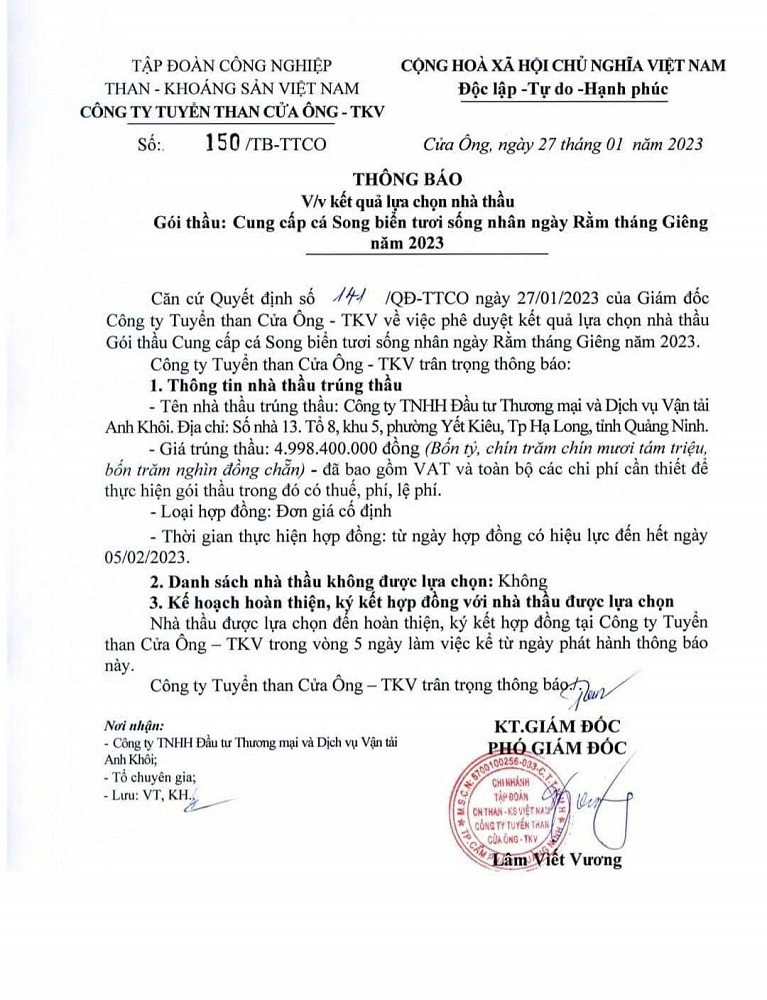 Trước đó, ngày 27/1, Công ty Tuyển than Cửa Ông – TKV có thông báo việc Công ty TNHH Đầu tư Thương mại và Dịch vụ vận tải Anh Khôi (TP.Hạ Long, Quảng Ninh) là đơn vị trúng gói thầu cung cấp cá song biển ngày Rằm tháng Giêng 2023. Giá trúng thầu là 4,99 tỷ đồng (đã bao gồm VAT và toàn bộ chi phí cần thiết để thực hiện gói thầu, trong đó, có thuế, phí và lệ phí). Đây là loại hợp đồng có đơn giá cố định và thời gian có hiệu lực đến hết ngày 5/2/2023 (ngày Rằm tháng Giêng).