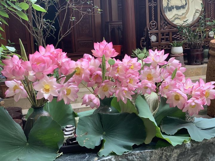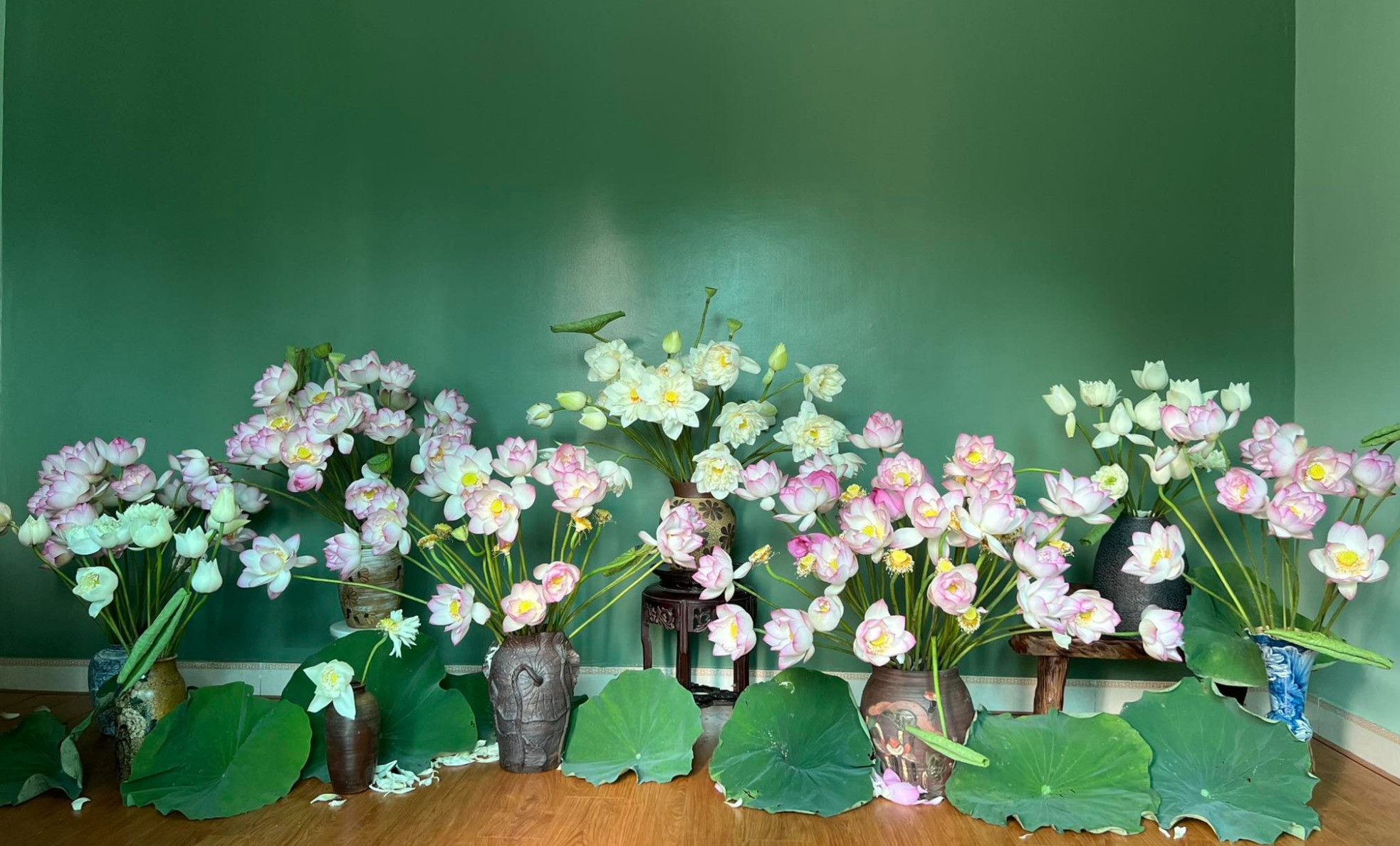 Bí quyết cắm đầm sen đẹp của chị là phải có thật nhiều lá tươi, cắm tầng lớp xen kẽ nhau và nên cắm ở không gian có nhiều cây xanh, rộng rãi để tạo chiều sâu.