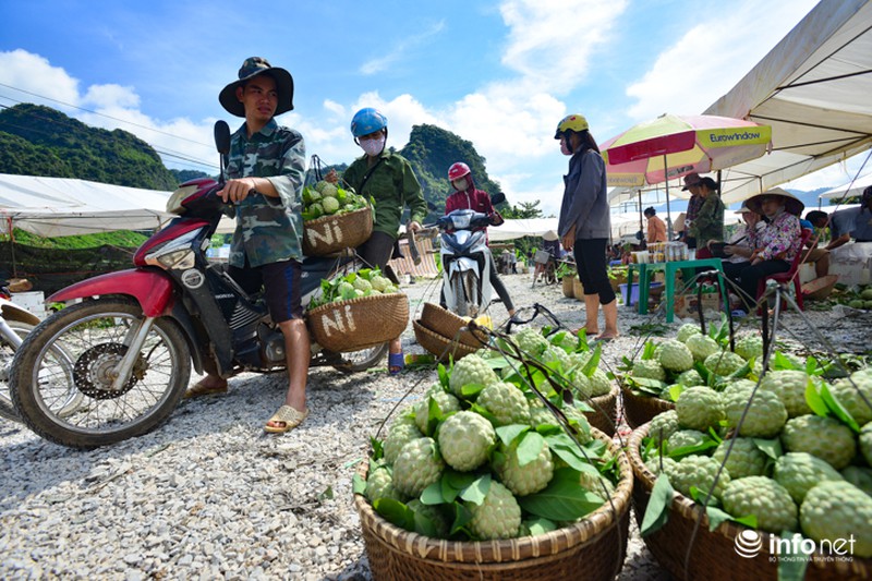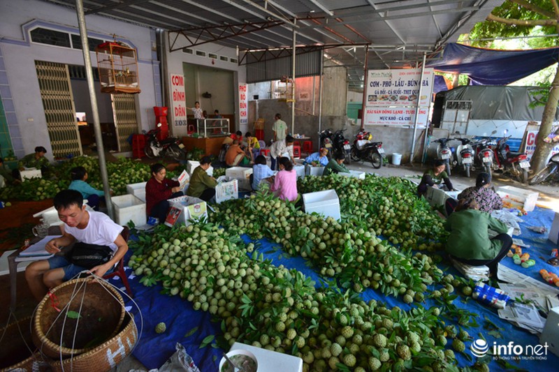Na tại chợ Đồng Bành được lái buôn từ khắp các tỉnh miền Bắc về tận nơi thu mua từ từng người bán rồi mang ra điểm tập kết đóng hàng chuyển đi. Quả na tập kết ở đây chủ yếu là na ương, chỉ sau vài giờ hái sẽ chín mở mắt. |