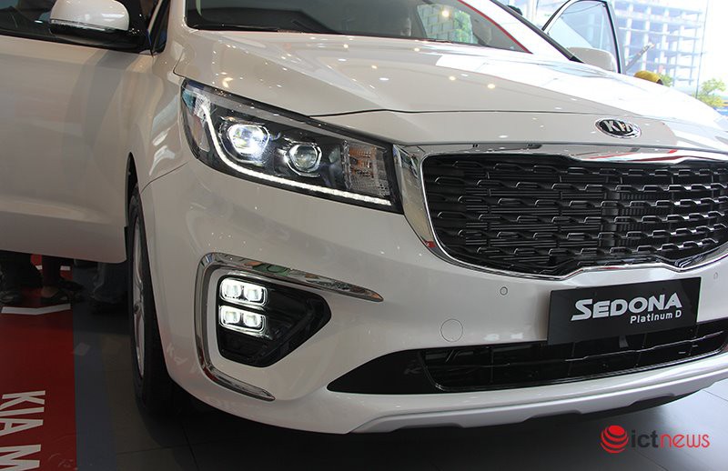 Kia Sedona 2019 sở hữu phần đầu xe với nhiều chi tiết được thiết kế mới như cản trước, lưới tản nhiệt và đèn xe được viền mạ crom trông bắt mắt và sang trọng hơn. Thay đổi đáng kể ở phiên bản xe mới là đèn pha sử dụng công nghệ LED thay cho công nghệ HID ở phiên bản trước. Dải đèn LED định vị ban ngày dài hơn và cụm đèn sương mù cũng bắt mắt hơn.
