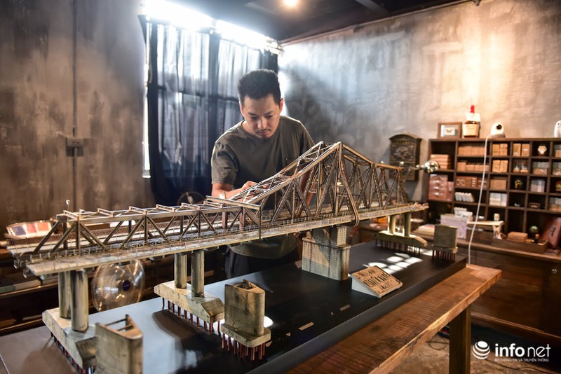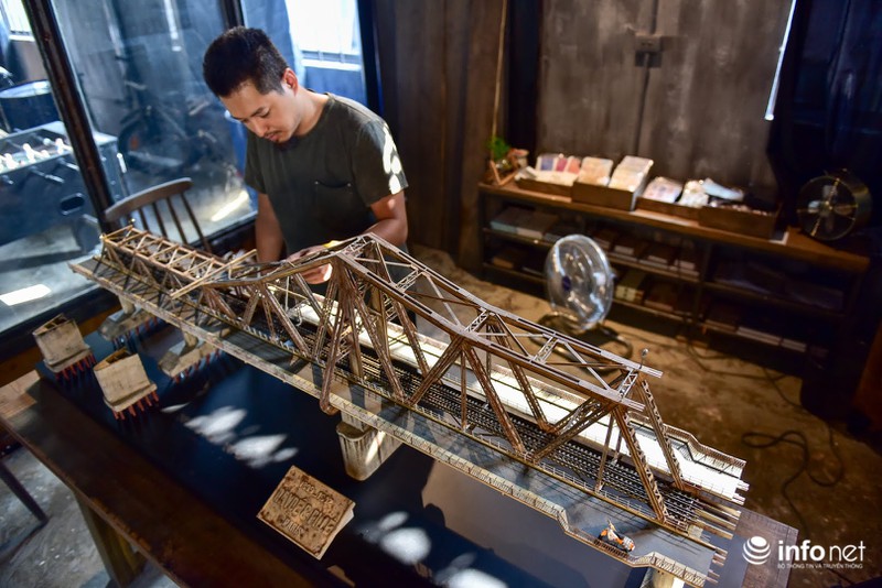 Theo anh Nguyễn Hồng Vỹ - chủ nhân của mô hình cầu Long Biên cho hay, dự án do anh và nghệ nhân Nguyễn Thiện Chương (Đà Lạt) phối hợp thực hiện. Khâu lên ý tưởng và cung cấp tư liệu được anh Vỹ đảm nhận, còn phần chế tác dựng mô hình được nghệ nhân Chương phụ trách. |