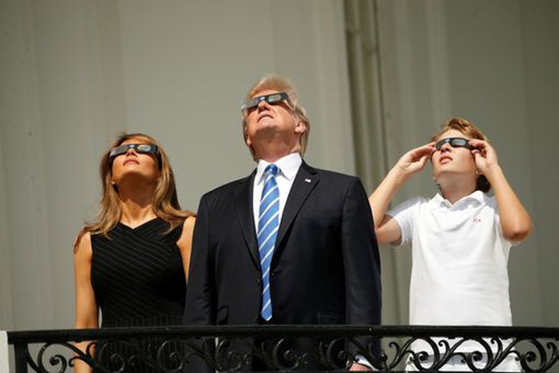 Tổng thống Mỹ Donald Trump cùng đệ nhất phu nhân và con trai quan sát nhật thực từ nhà trắng |