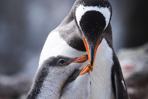Ba mẹ con chim cánh cụt đang âu yếm nhau |