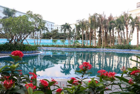 Bể bơi ngoài trời xanh mát cũng được bao bọc bởi các cây xanh, hoa lá giúp cư dân thư giãn mỗi ngày.