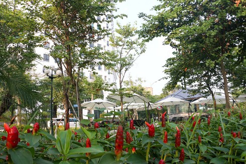 Ngay từ nội khu, các hàng cây đường kính lớn được chủ đầu tư lựa chọn trồng để lấy bóng mát. Xen vào đó là các vườn hoa, cây tầm thấp và tầm trung được trồng men theo các lối đi dạo.