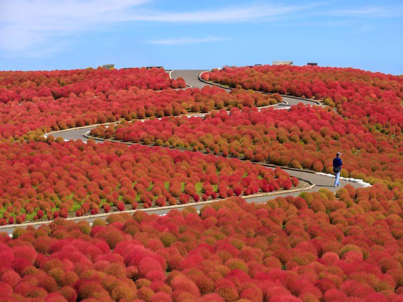 Công viên bờ biển Hitachi ở Ibaraki, Nhật Bản trồng tới 350 ha hoa. Hoa nemophila màu xanh nổi tiếng của công viên đang vào mùa từ cuối tháng 4 đến giữa tháng 5. Còn những bụi cây kokia màu xanh lá cây chuyển sang màu đỏ rực rỡ vào tháng 10. |