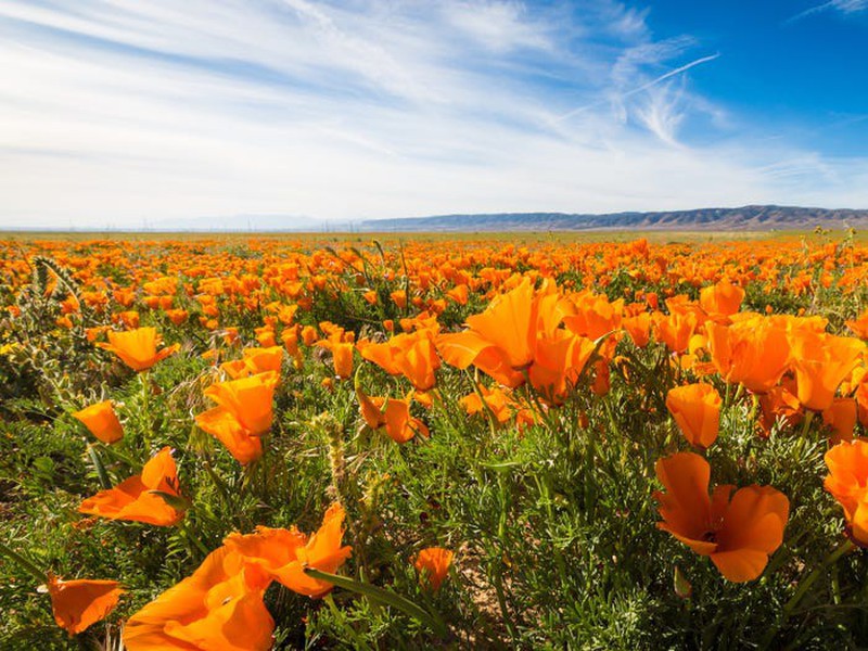 Thung lũng Antelope thuộc khu bảo tồn Poppy gần Lancaster, California, Mỹ nổi tiếng với thảm hoa poppy màu cam rực rỡ. |