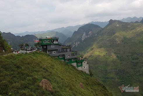 Từ ngày 11/10, bà Vũ Thị Ánh, chủ công trình 7 tầng trên đỉnh Mã Pì Lèng nhìn ra hẻm Tu Sản đã cho thợ sơn quét sơn xanh toàn bộ công trình đang bị dư luận lên án.