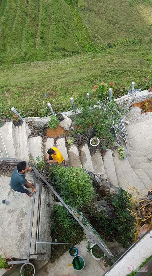 Một nhóm người khác trang trí, trồng cây trên các bậc lên xuống |