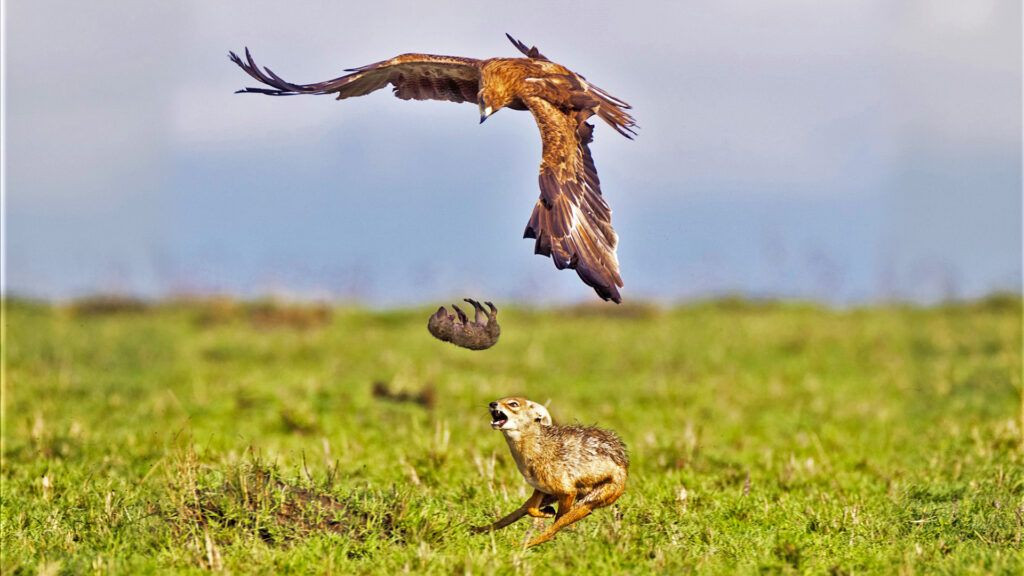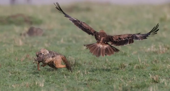 Một lúc sau, bất ngờ xuất hiện một con đại bàng Tawny, nó sà xuống và nhanh chóng ngoạm lấy con chó con nhưng không thành công vì chó mẹ nhanh hơn một bước, cúi người xuống che cho con.