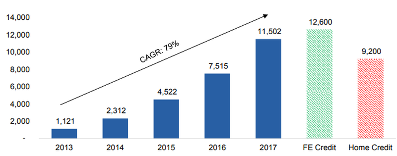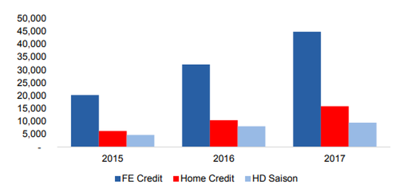 Tính theo quy mô khoản vay, FE Credit cao hơn nhiều so với HD Saison với tổng cho vay khách hàng đạt 44,8 nghìn tỷ đồng so với chỉ 9,4 nghìn tỷ đồng trong năm 2017. Tăng trưởng cho vay tại HD Saison giảm trong năm 2017 chỉ còn 17,3% so với 71,5% năm 2016.