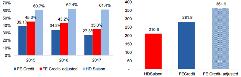 VCSC cũng lưu ý rằng báo cáo tài chính của HD Saison minh bạch hơn so với FE Credit. FE Credit cũng tỏ ra vượt trội về tỷ lệ chi phí/thu nhập.
