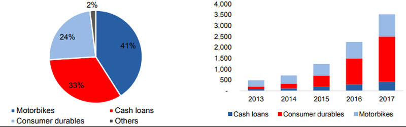 Theo đánh giá của Nielsen, mảng tài chính tiêu dùng dự kiến sẽ tăng trưởng kép (CAGR) hằng năm là 20%. Danh mục sản phẩm tài chính của các công ty tài chính hiện nay tập trung vào cho vay mua xe máy; cho vay mua hàng tiêu dùng gia dụng; các khoản vay khác.