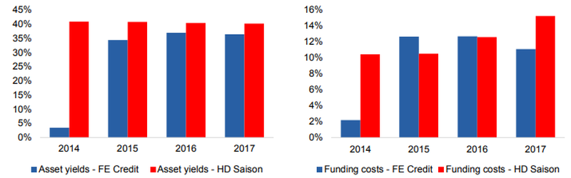 Lợi thế về quy mô trong việc khai thác một lượng lớn huy động nợ bán buôn được phản ánh rõ ràng trong chi phí cấp vốn của FE Credit, trong khi vẫn chưa rõ ràng với HD Saison.