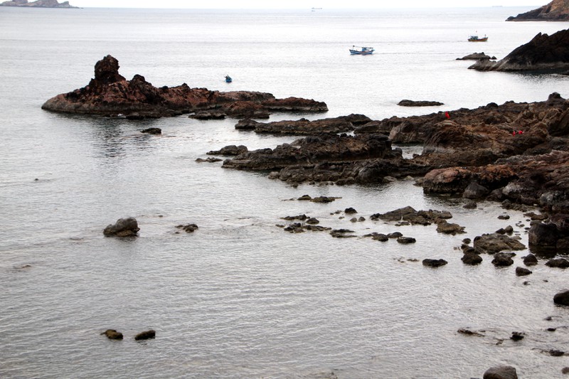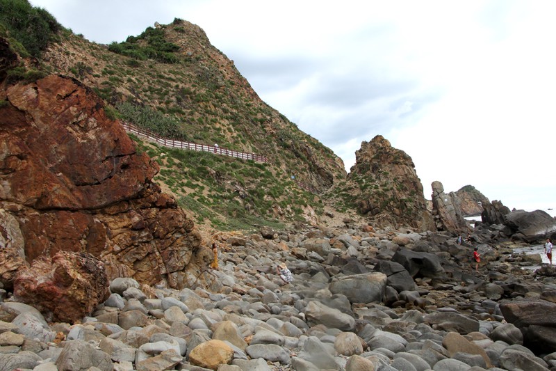 Thay vì bãi cát trắng mịn như nhiều bờ biển tại các tỉnh miền Trung, bờ biển tại đây là những khối đá đủ màu sắc, kích cỡ. Qua hàng triệu năm được sóng biển bào mòn, các khối đá không còn cạnh sắc mà đã được bo tròn, bằng phẳng.