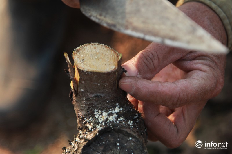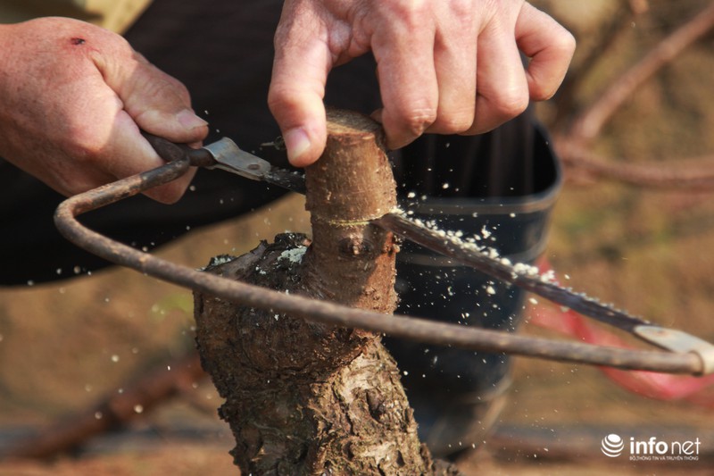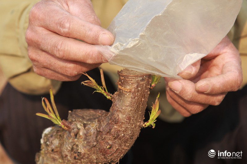 Công đoạn cắt ghép khá tỉ mỉ, cần những thợ vườn lành nghề. Còn với gốc đào, tuổi thọ của mỗi gốc từ 12-15 năm. Sau khi cây già, chủ vườn sẽ ươm tán cây thật đẹp và bán cả gốc đào, thay vì cắt cành bán. |