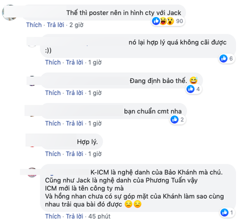 Tuy nhiên có vẻ như Hứa Minh Đạt có chút nhầm lẫn, K-ICM là nghệ danh riêng của Nguyễn Bảo Khanh chứ không phải là một công ty, một tập thể. Công ty chung của K-ICM và Jack là ICM Entertainment. Chính vì vậy cách mà Hứa Minh Đạt nói về việc thiết kế trên poster của Jack và K-ICM như vậy là không đúng. Vì hiện tại trên thị trường Vpop, ít có ca sĩ nào làm poster mà đưa nguyên cả dàn hậu kì đông đảo như vậy lên cả. Mặc dù lên tiếng bênh vực mà muốn giảng hòa cho cả K-ICM và Jack nhưng Hứa Minh Đạt vẫn bị bắt bẻ vì không phân biệt giữa cá nhân và công ty.