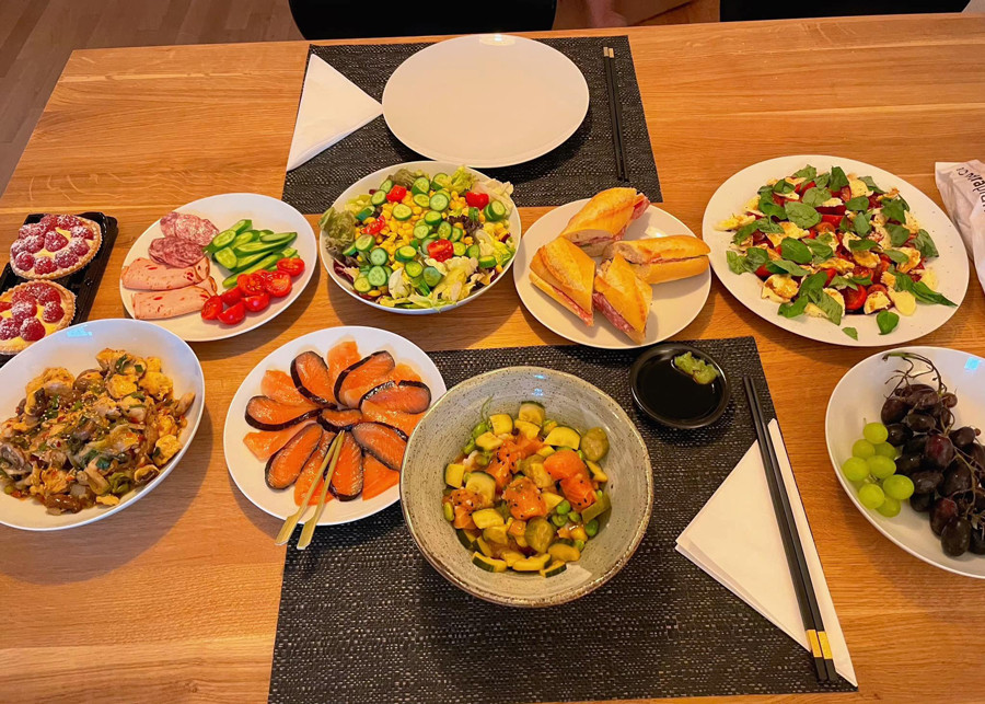 Ngoài các loại rau củ quả, thịt, cá, trứng, sữa, anh còn mua đa dạng đồ khô, đồ đông lạnh rồi trữ trong bếp để bất cứ khi nào cũng có thể nấu nướng. Với tiêu chí tốt cho sức khoẻ, ngon miệng và bày biện đẹp mắt, anh Ivo khá kỹ tính khi chế biến.