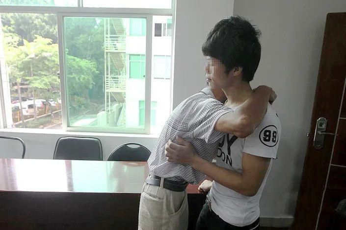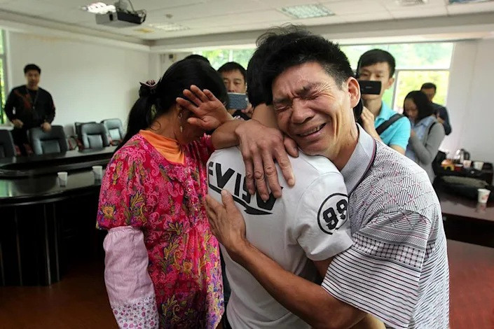 Ông Sun Zhenghua lao tới ôm cậu con trai mà khóc, trong khi vợ ông đứng lặng lẽ một bên lau nước mắt không ngừng rơi.