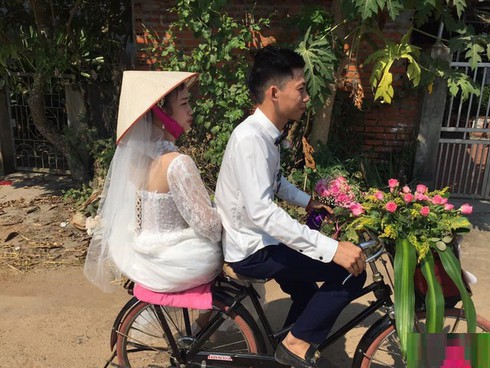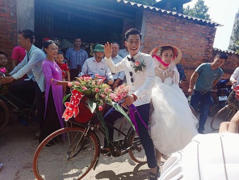 Không xa hoa, cầu kì, không đón dâu bằng ô tô 4 chỗ nhưng dường như cặp đôi rất vui khi tự đèo nhau trên chiếc xe đạp. Nhiều dân mạng đoán rằng nhà cô dâu và chú rể ở gần nhà nên đón dâu bằng xe đạp vừa hợp lý vừa thú vị.