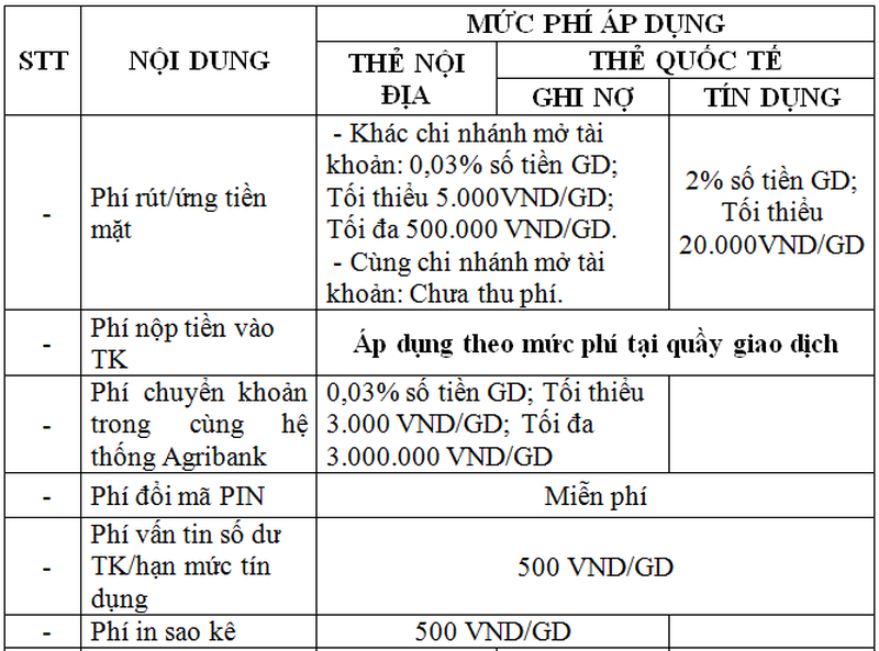 Tại Agribank, theo biểu phí dịch vụ thẻ được ngân hàng này công bố áp dụng kể từ 02/10/2017, phí phát hành thẻ ATM được quy định từ 50.000 đồng – 100.000 đồng tùy từng loại thẻ. Phí duy trì thẻ (phí thường niên) từ 12.000 – 50.000 đồng. Phí rút tiền 1.100 đồng/giao dịch, trong khi phí chuyển khoản trong cùng hệ thống Agribank hay phí chuyển tiền vào tài khoản tiết kiệm tối thiểu 3.000 đồng và tối đa 15.000 đồng/giao dịch.