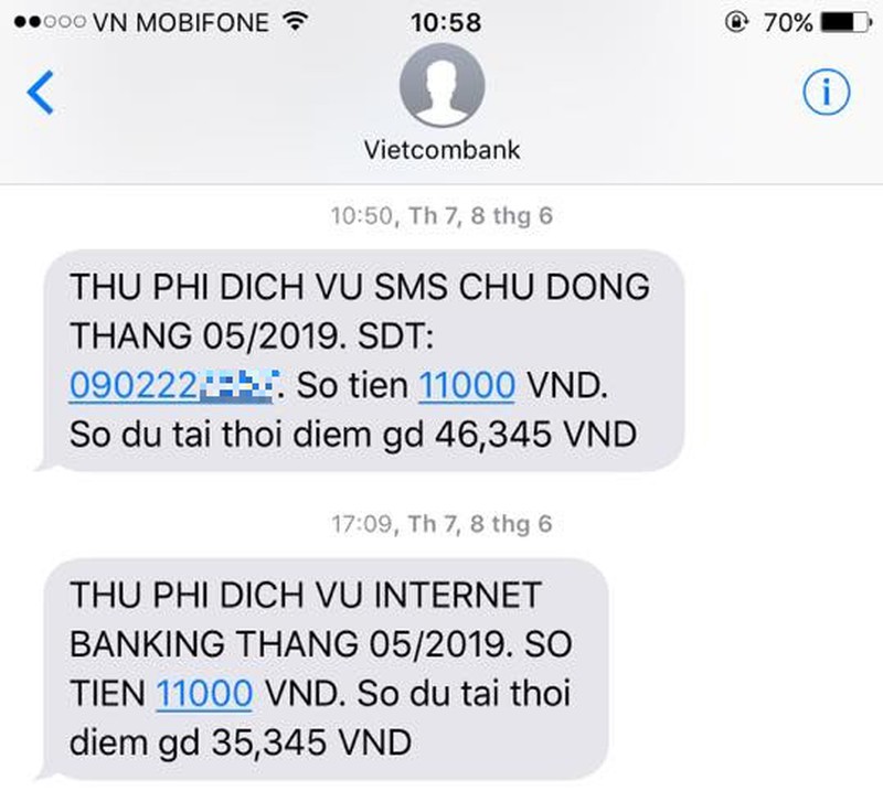 Mỗi tháng, khách hàng của Vietcombank phải trả 11.000 đồng phí dịch vụ SMS và 11.000 đồng cho phí dịch vụ internet banking. |