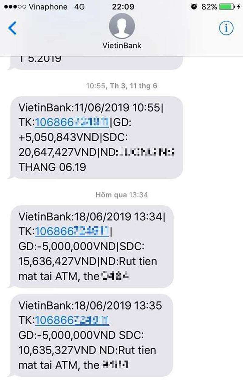 | Hai lần rút tiền 5 triệu đồng/lần, ATM của Vietinbank trừ phí 11.000 đồng cho lần thứ nhất, lần thứ 2 trừ 1.100 đồng. |