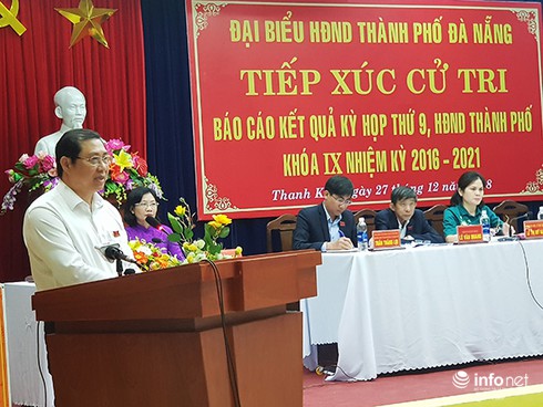 Chủ tịch UBND TP Đà Nẵng Huỳnh Đức Thơ thông tin cho cử tri quận Thanh Khê một số nội dung chính của kết luận thanh tra về các dự án đầu tư tại bán đảo Sơn Trà sắp được Thanh tra Chính phủ chính thức công bố (Ảnh: HC) |