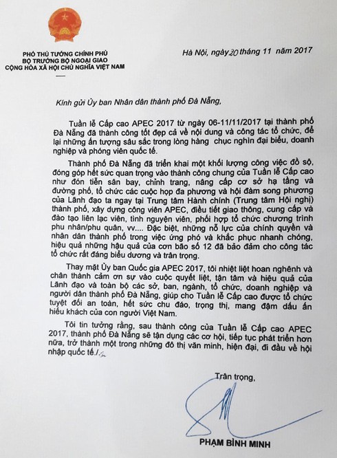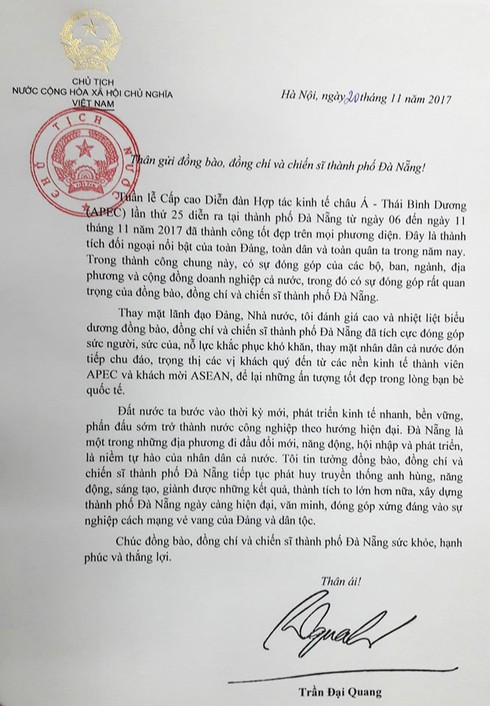 Trong bức thư Chủ tịch nước thay mặt lãnh đạo Đảng, Nhà nước, đánh giá cao và nhiệt liệt biểu dương đồng bào, đồng chí và chiến sĩ thành phố Đà Nẵng đã tích cực đóng góp sức người, sức của, nỗ lực khắc phục khó khăn, thay mặt nhân dân cả nước đón tiếp chu đáo, trọng thị các vị khách quý đến từ các nền kinh tế thành viên APEC và khách mời ASEAN, để lại những ấn tượng tốt đẹp trong lòng bạn bè quốc tế.