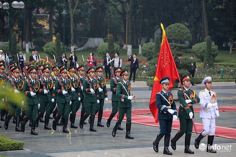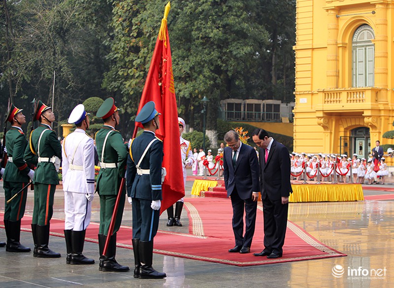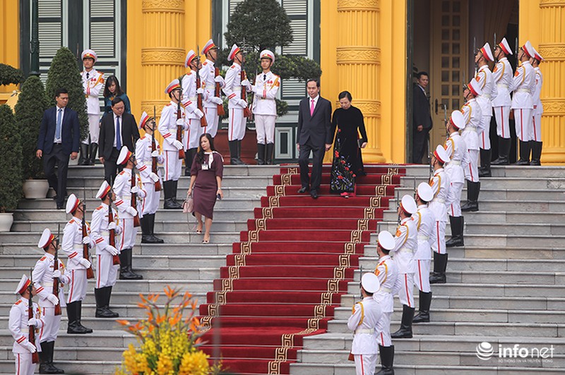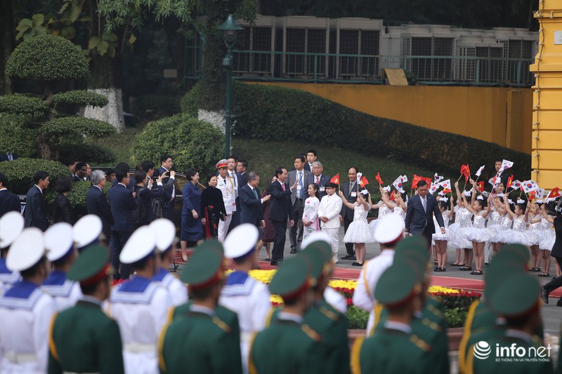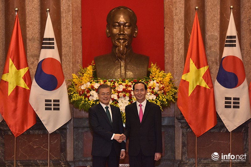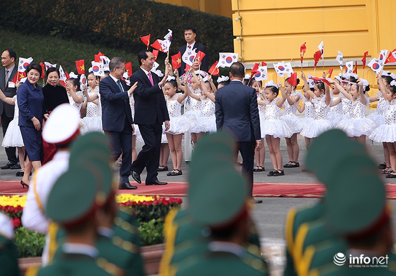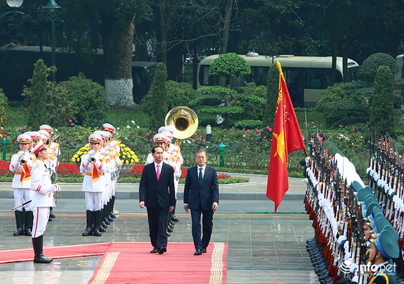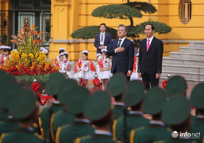 Trong ngày làm việc chính thức đầu tiên tại Việt Nam, Tổng thống Hàn Quốc Moon Jae In đã được Chủ tịch nước Trần Đại Quang tiếp đón tại Phủ Chủ tịch theo nghi lễ cấp Nhà nước.
