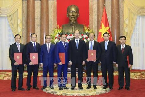 Chủ tịch nước Trần Đại Quang trao Quyết định phong hàm Đại sứ bậc I và Đại sứ bậc II cho các đồng chí cán bộ công chức của Bộ Ngoại giao. Ảnh: Nhan Sáng-TTXVN |