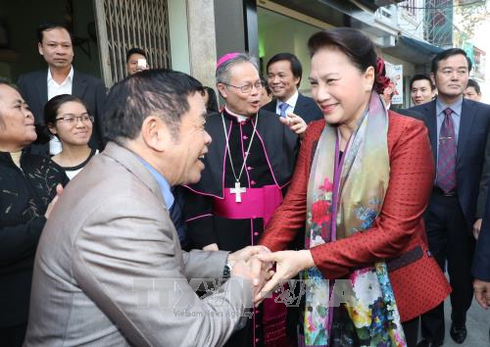 Chủ tịch Quốc hội Nguyễn Thị Kim Ngân thăm, tặng quà một số gia đình Công giáo tiêu biểu tại TP. Thanh Hóa. Ảnh: TTXVN |