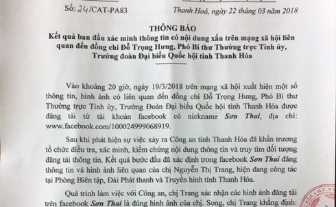 Từ kết quả điều tra, xác minh của các cơ quan chức năng tỉnh Thanh Hóa, khẳng định đối tượng đã tạo dựng tin nhắn có nội dung bịa đặt, sử dụng facebook Sơn Thai đăng tải, phát tán với động cơ mục đích xấu, xúc phạm danh dự, uy tín cá nhân của ông Đỗ Trọng Hưng, Phó Bí thư Thường trực Tỉnh ủy, Trưởng Đoàn Đại biểu Quốc hội tỉnh, nhằm gây mất ổn định tình hình an ninh trật tự trên địa bàn.
