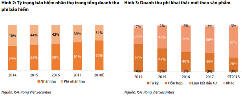 Tỷ trọng các sản phẩm liên kết đầu tư ngày càng tăng trong doanh thu phí khai thác mới, 67% trong 9 tháng đầu năm 2018 so với 33% của cả năm 2014. Với xu hướng này, bảo hiểm liên kết đầu tư sẽ là nguồn thu chính của các doanh nghiệp bảo hiểm nhân thọ trong thời gian tới.