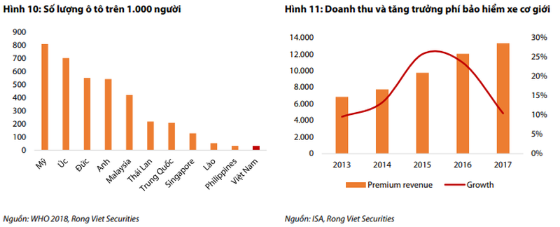 Tỷ lệ sở hữu ô tô trong dân số Việt Nam còn thấp so với nhiều quốc gia, thấp hơn so với Lào và Philipines. Hơn nữa, tất cả các phương tiện tham gia giao thông đều bắt buộc phải có bảo hiểm. Các yếu tố này tạo ra dư địa tăng trưởng rất lớn cho bảo hiểm xe cơ giới, trong đó có hơn 90% là bảo hiểm ô tô.