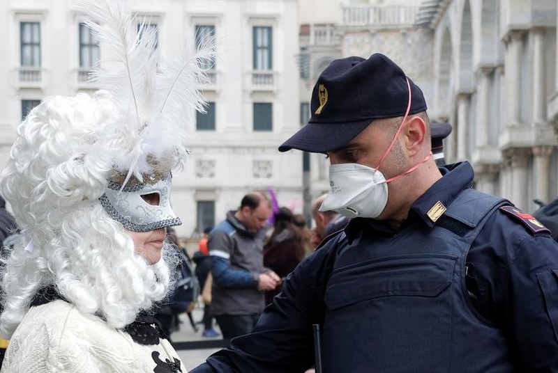 Những người tham gia trình diễn tại lễ hội Venice Carnival, Italy cũng trang bị khẩu trang để tự bảo vệ mình. |