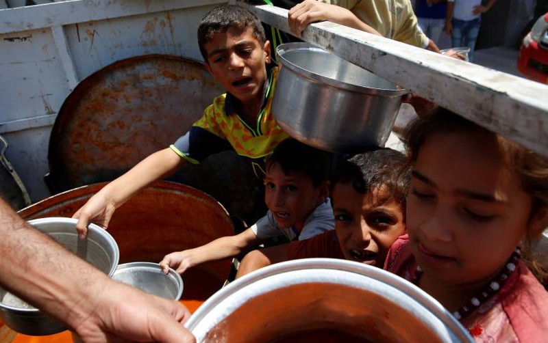 Trẻ em thành phố Mosul nhận đồ ăn được phát miễn phí. |