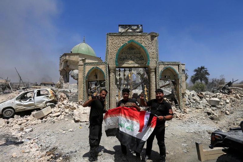 Các thành viên Lực lượng Chống khủng bố Iraq chụp ảnh ở khu vực đền thờ Grand al-Nuri khu phố cổ Mosul sau khi giành lại được từ tay IS. |
