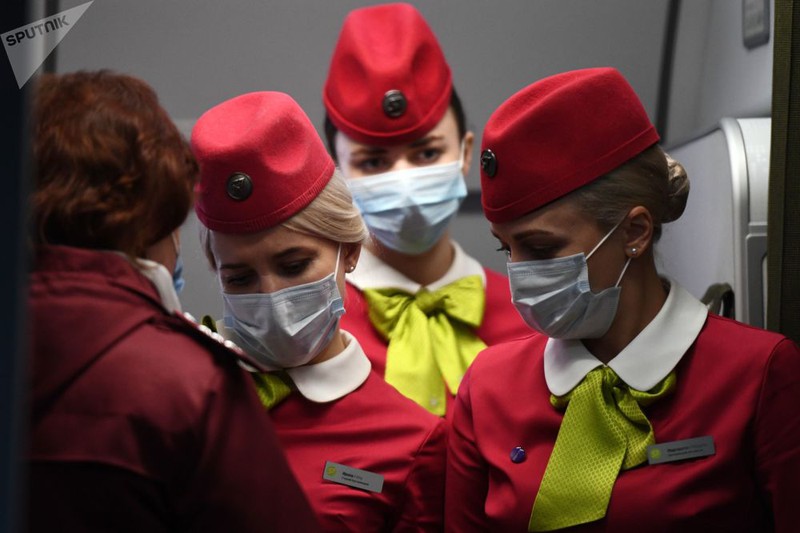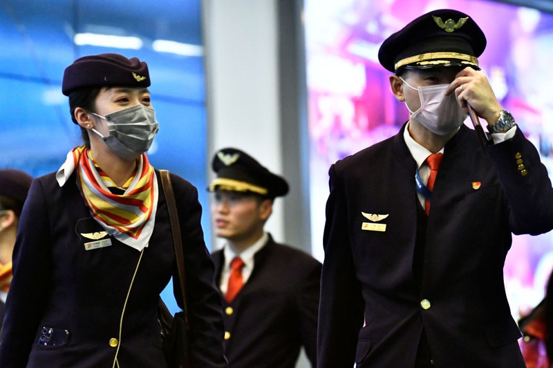 Các tiếp viên hàng không sử dụng khẩu trang trong lúc làm việc để phòng tránhcoronavirus. |