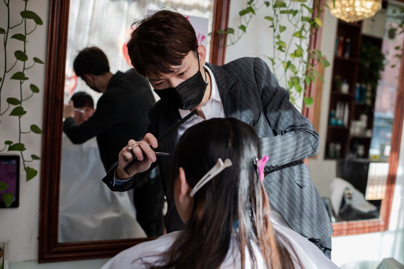 Thợ cắt tóc sử dụng khẩu trang khi làm việc. |