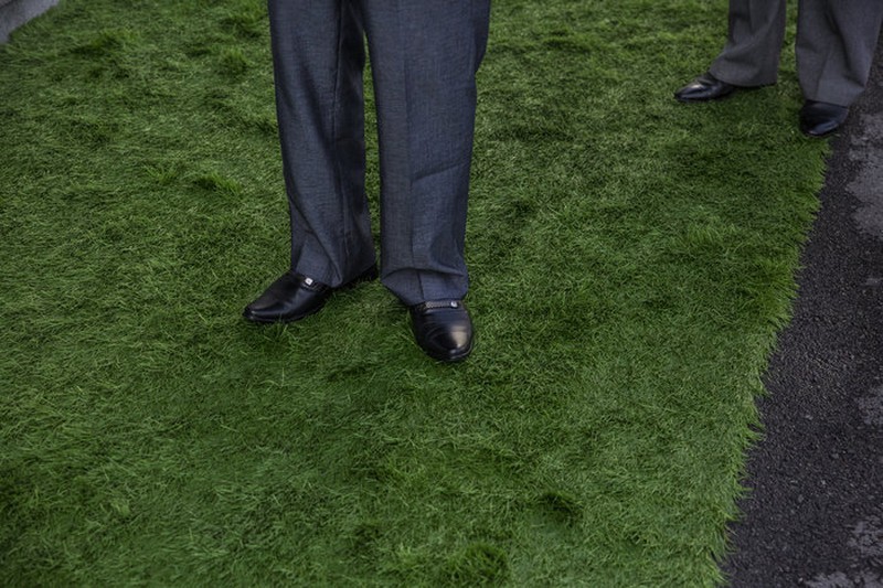 Bảo vệ an ninh cùng máy phát hiện kim loại dàn hàng ngang tại Nhà hát Nhân dân Mansudae ở Bình Nhưỡng. |