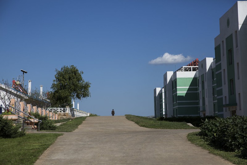 Một người đàn ông Triều Tiên đi dọc con đường ở một hợp tác xã. |