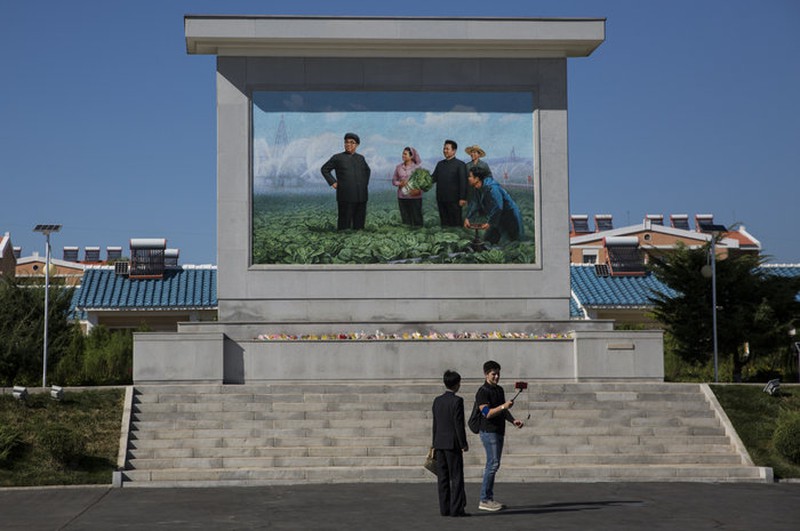Một phóng viên người Nga chụp hình cùng một sĩ quan Triều Tiên gần bức tranh tường ở một nông trại Triều Tiên. |