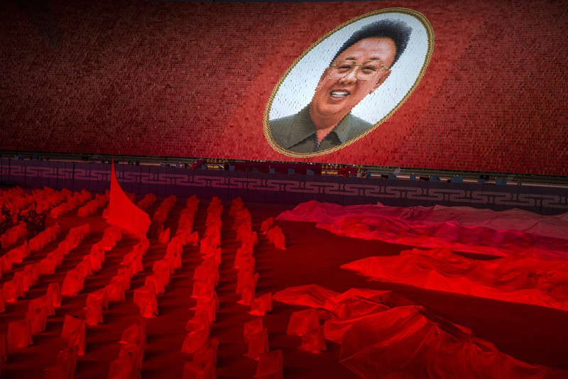 Màn đồng diễn hoành tráng của Triều Tiên có sự tham gia của hàng trăm ngàn người. Khán giả trên sân vận động mang theo những tấm thẻ màu, cùng nhau hợp lại thành chân dung cố Chủ tịch Triều Tiên Kim Jong-il. |
